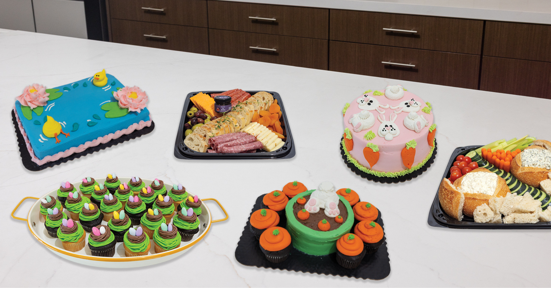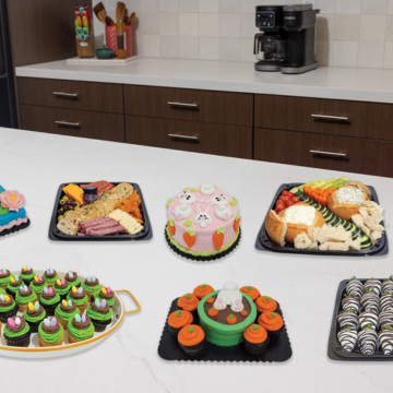 Order party trays, themed cakes and cupcakes, and charcuterie boards, perfect for your Easter festivities.