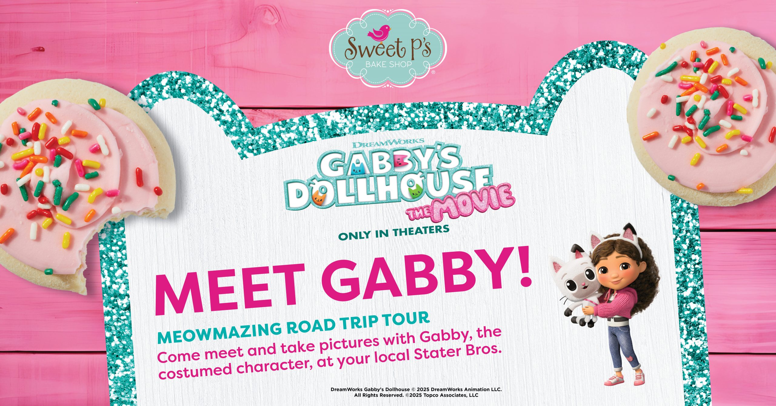 We’re bringing Gabby’s Dollhouse to your local Stater Bros.! Stop by our Colton store and get a chance to bring your little fans to meet Gabby herself! Come meet and take pictures with Gabby and grab some tasty Gabby’s Dollhouse treats from Sweet P’s Bake Shop.