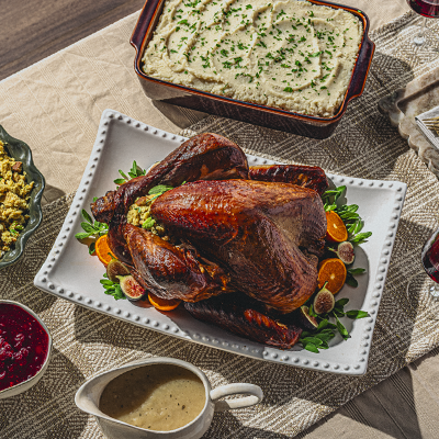 Cornbread Stuffing, Mashed Potatoes, Homestyle Gravy, and Cranberry Sauce.