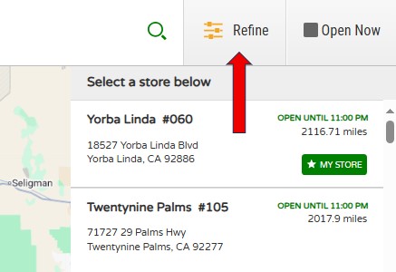 Refine your store selection by pressing the “Refine” button on the store locator.