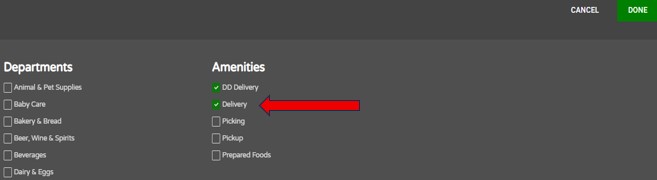 Under Amenities check mark “Delivery”. Once marking for delivery, you can now click on the green “Done” box to apply the filter
