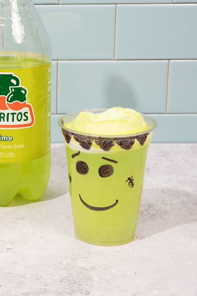 Watch your little monsters’ faces light up when they see their own Frankenstein friend staring back at them from their drink! Create a mocktail that’s as cool as it is spooky with our Frankenstein’s Fizz recipe. Gather these ingredients: