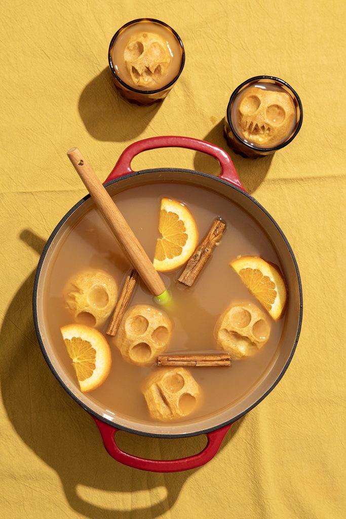 Pour cider into bowl with shrunken head apples. Add desired cinnamon sticks and orange slices.